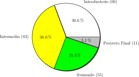 y por niveles de cursos (Introductorios, Intermedios, Avanzados y Proyectos).